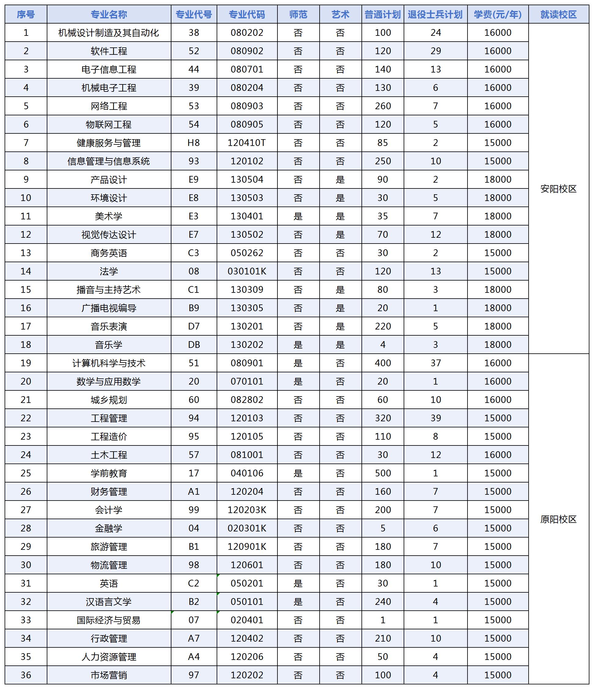 安阳学院2025年专升本招生计划一览表