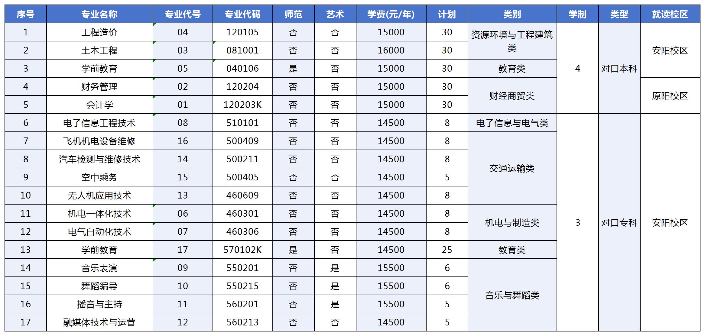安阳学院2025年对口本专科招生计划一览表