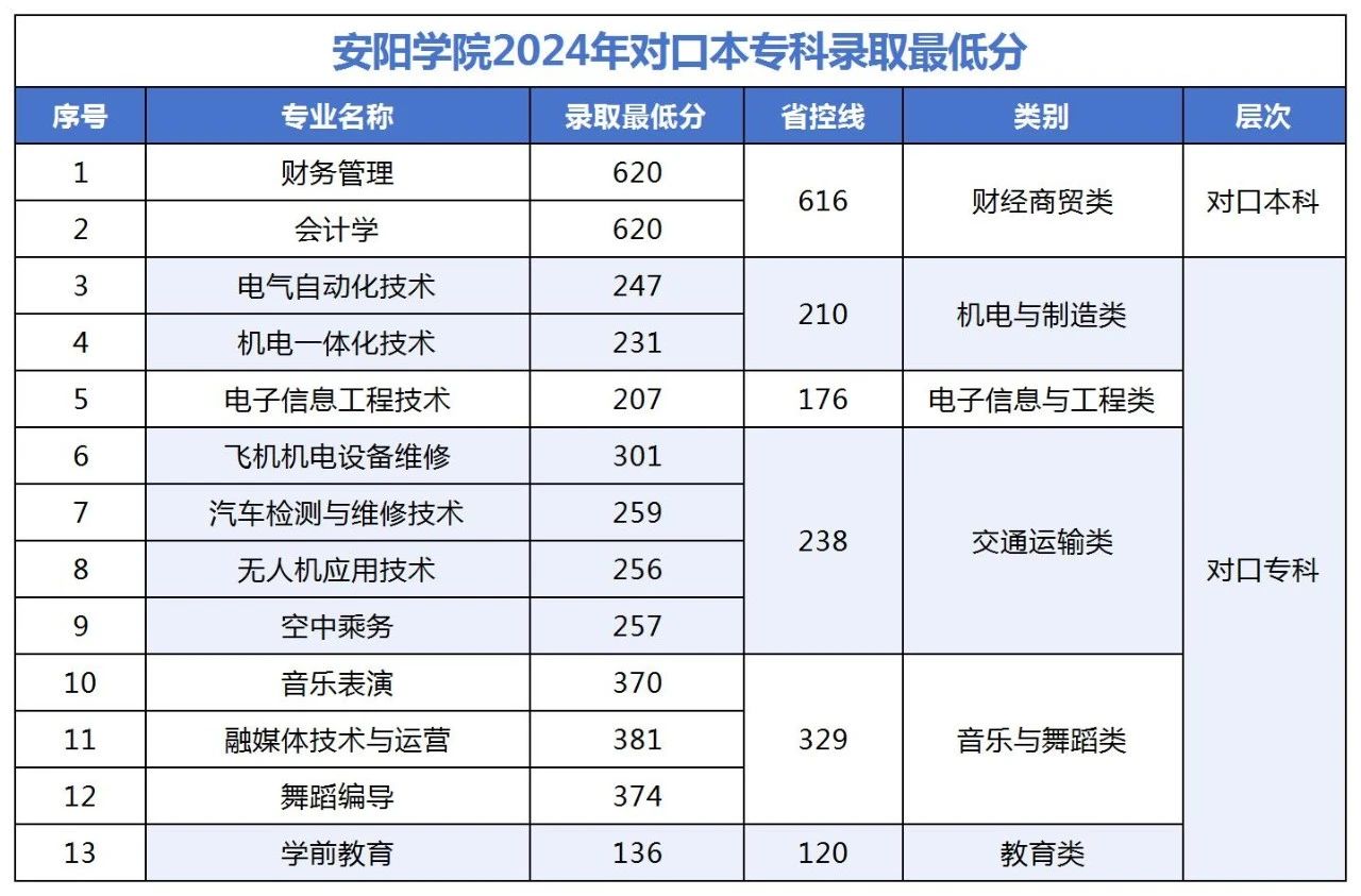 安阳学院2024年对口本专科录取分数统计