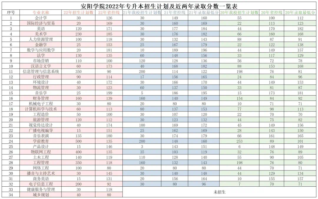 安阳学院2022年专升本招生计划及近两年录取分数一览表